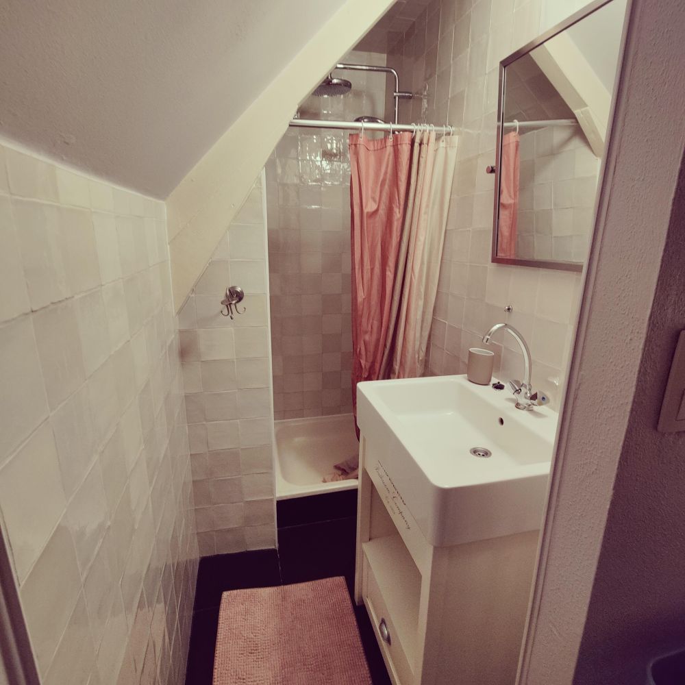 Een badkamer met douche en wastafel. Haarföhn, kinderstoel en campingbedje zijn aanwezig.